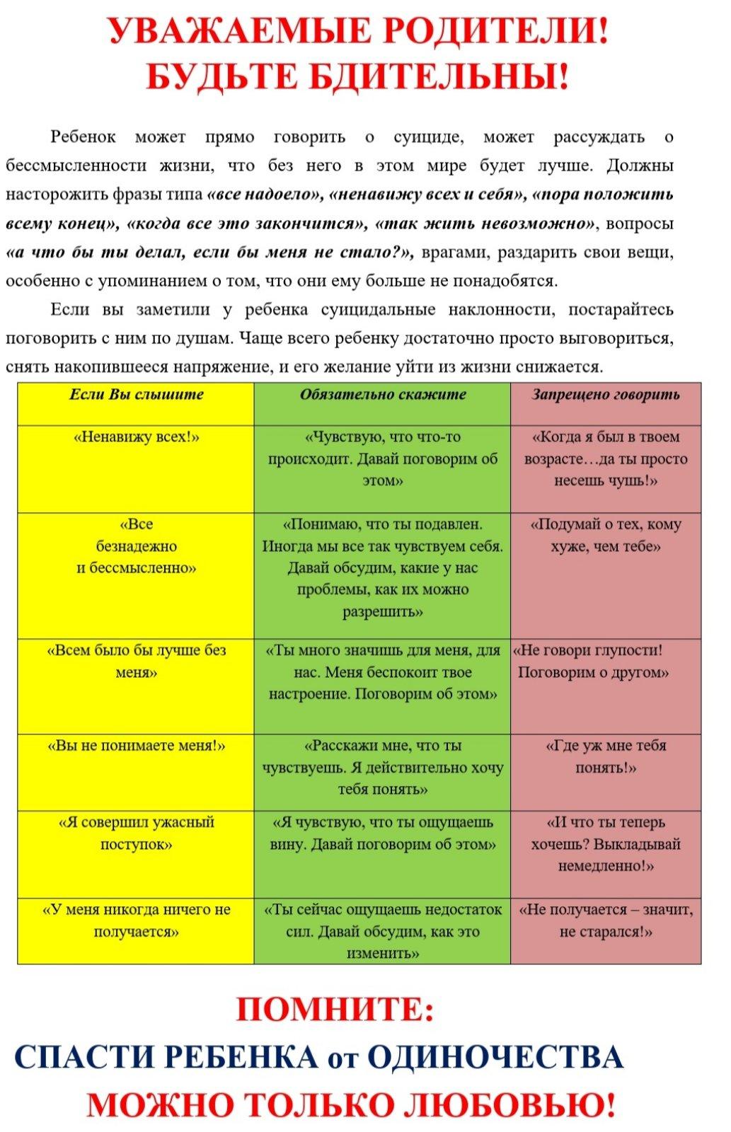 Памятка по суицидальному поведению детей и подростков (ссылка)